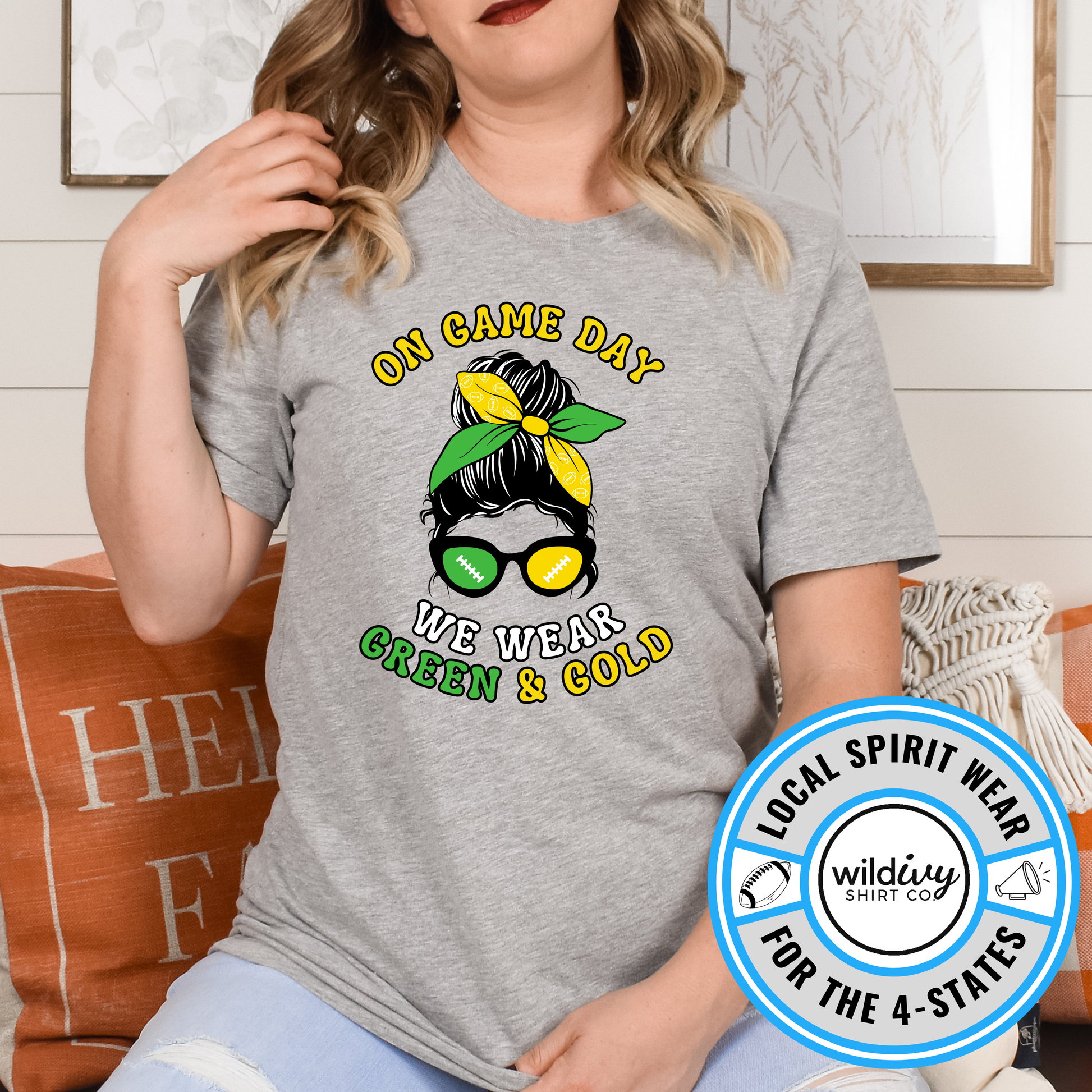 On Game Day We Wear Green & Gold Messy Bun